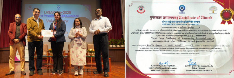 Ms. Kanika Arora, PhD researcher under the supervision of Dr. Shyam Lal Mudavath and Dr. Asifkhan Shanavas at INST Mohali, has secured the First Position (Best Poster Award) at LASAICON-2025, held from December 1–2, 2025 at CSIR-IMTECH, Chandigarh.