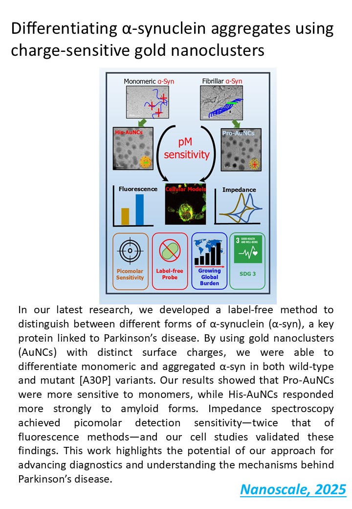 Our team is pioneering nanotechnology to tackle pressing biomedical challenges, with a recent breakthrough in early Parkinson’s Disease (PD) detection. We have developed a novel biosensor using specially engineered gold nanoclusters (AuNCs) that can selectively distinguish between healthy and toxic forms of the α-synuclein protein, a key PD biomarker. This sensitive platform can identify pathological changes before clinical symptoms appear, paving the way for early intervention. Our work, conducted with collaborators at CSIR-IMTECH and published in Nanoscale, has been featured in a press release from the Department of Science and Technology (DST), and covered by The Tribune India and Daily India. These highlights underscore our commitment to creating innovative tools that can revolutionize diagnostics and improve patient outcomes for neurodegenerative diseases.