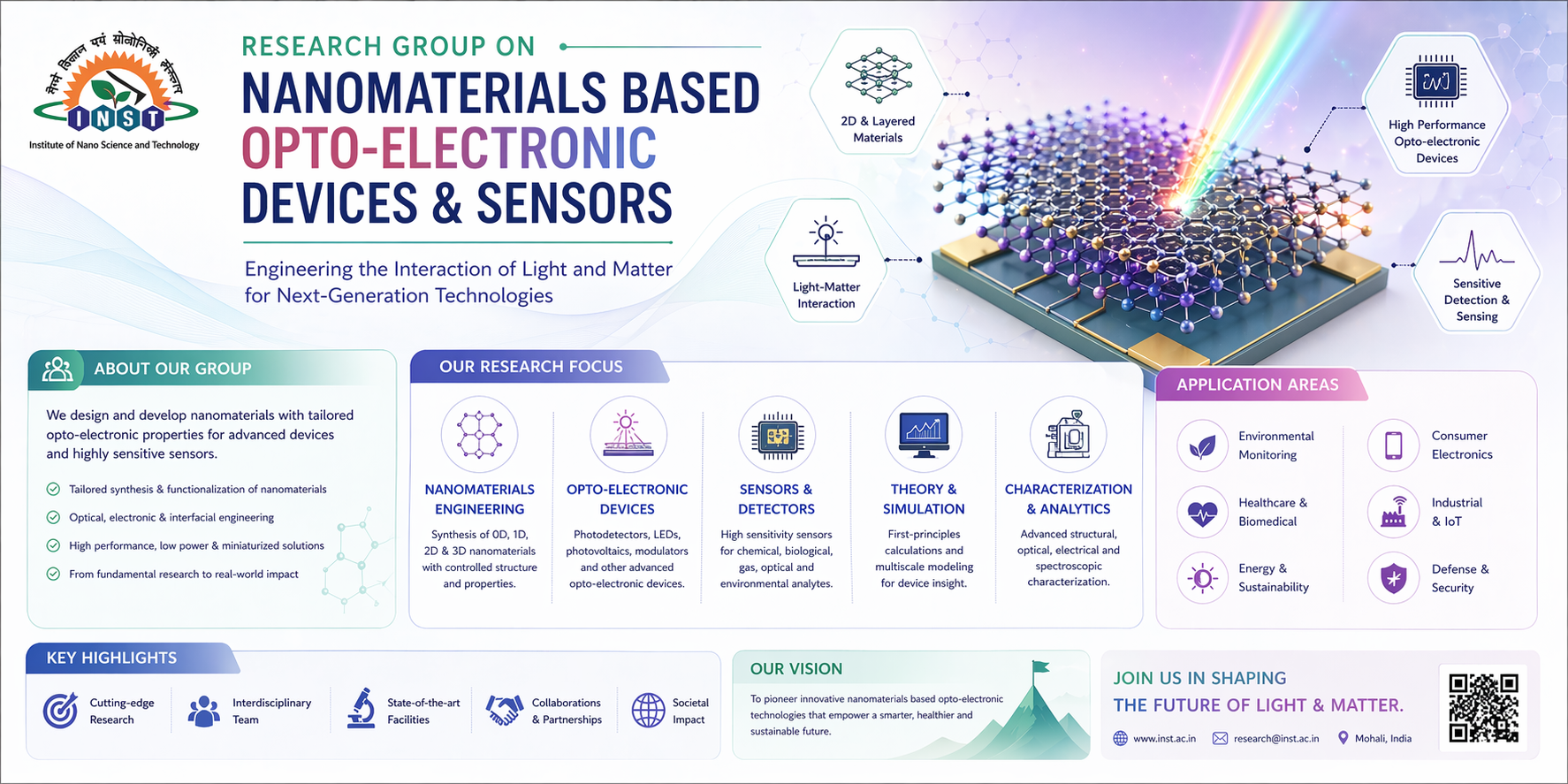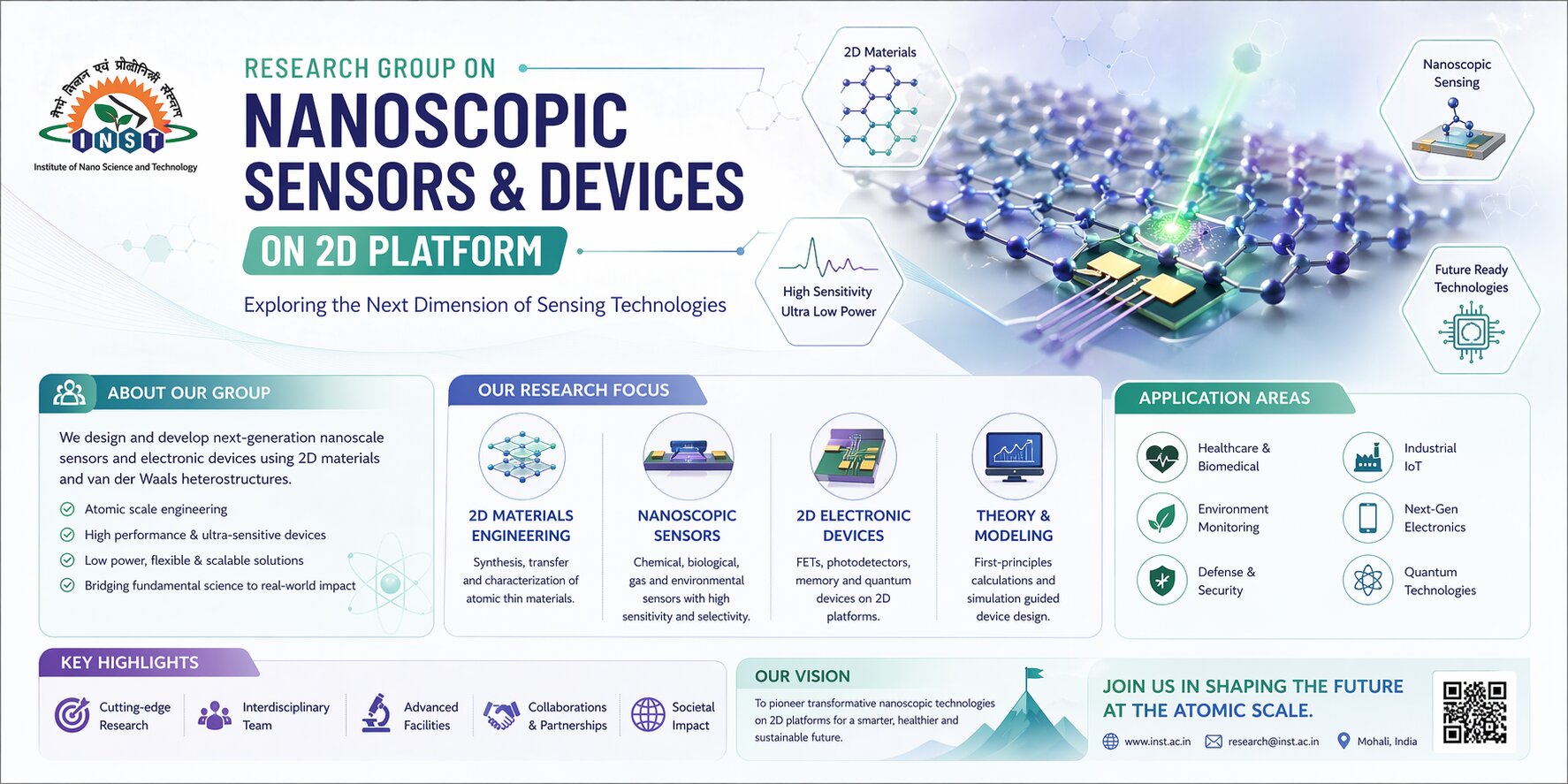 The Low Dimension Materials and Devices (LDMD) Group at INST Mohali drives innovation in nanostructured 2D semiconductors with artificial edges, nanoscopic sensors and devices on 2D platforms, and nanoscale optics/electronics via contact engineering, charge trapping, quasiparticle manipulation, and LSPR. We pioneer advanced SERS platforms for disease diagnostics and material quality monitoring, AI tools for Raman-based analyte fingerprinting, and fundamental light-matter interactions at the nanoscale—bridging nanoscopic electronics and spectroscopy, aiming practical applications. Our group encourages Wild and Original ideas !