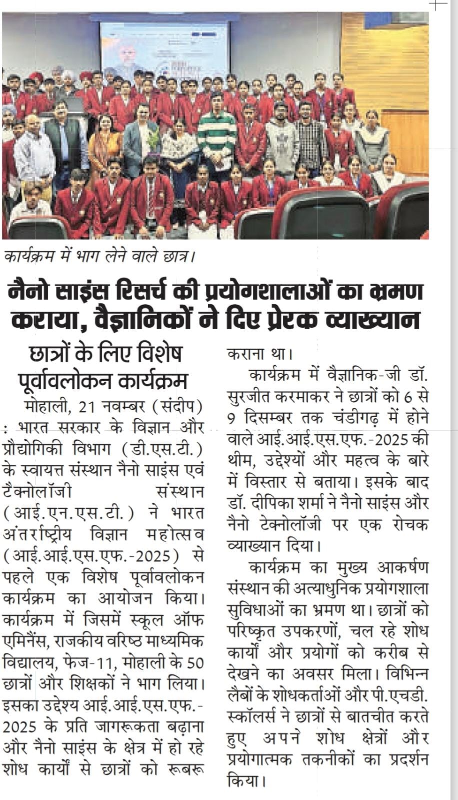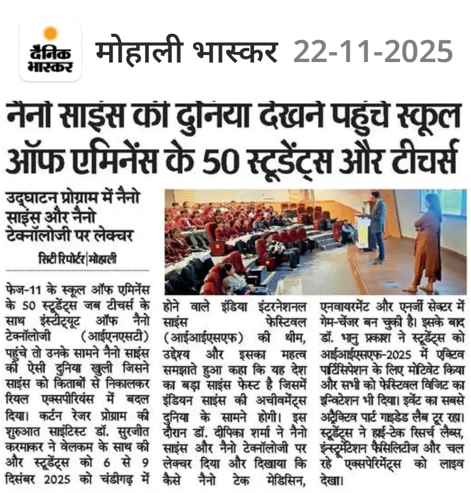 The Institute of Nano Science and Technology, Mohali, an autonomous Research Institute of DST, Govt. of India, organised a Curtain Raiser event, which was held on 21st November 2025, as a part of India International Science Festival (IISF)-2025. As a part of these programs, INST has invited 50 students along with teachers from School of Eminence, Government Senior Secondary School, Phase-11, Mohali, Punjab.