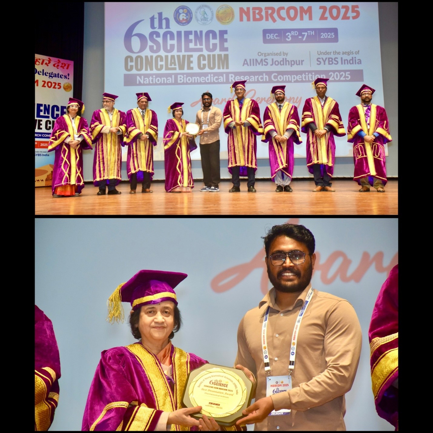 Heartiest Congratulations to Mr. Chandrashekhar Jori, PhD student of Dr. Rehan Khan for Winning the “Best Oral Presentation Award” at the 6th Science Conclave-NBRCOM 2025 (3-7, December 2025), AIIMS Jodhpur