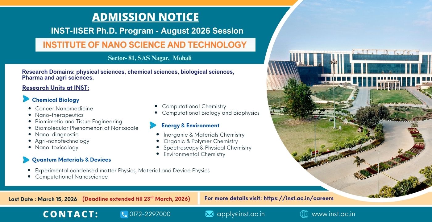 INST-IISER Ph.D. Program-Aug 2026 Session (Application Deadline extended till 23rd March, 2026)